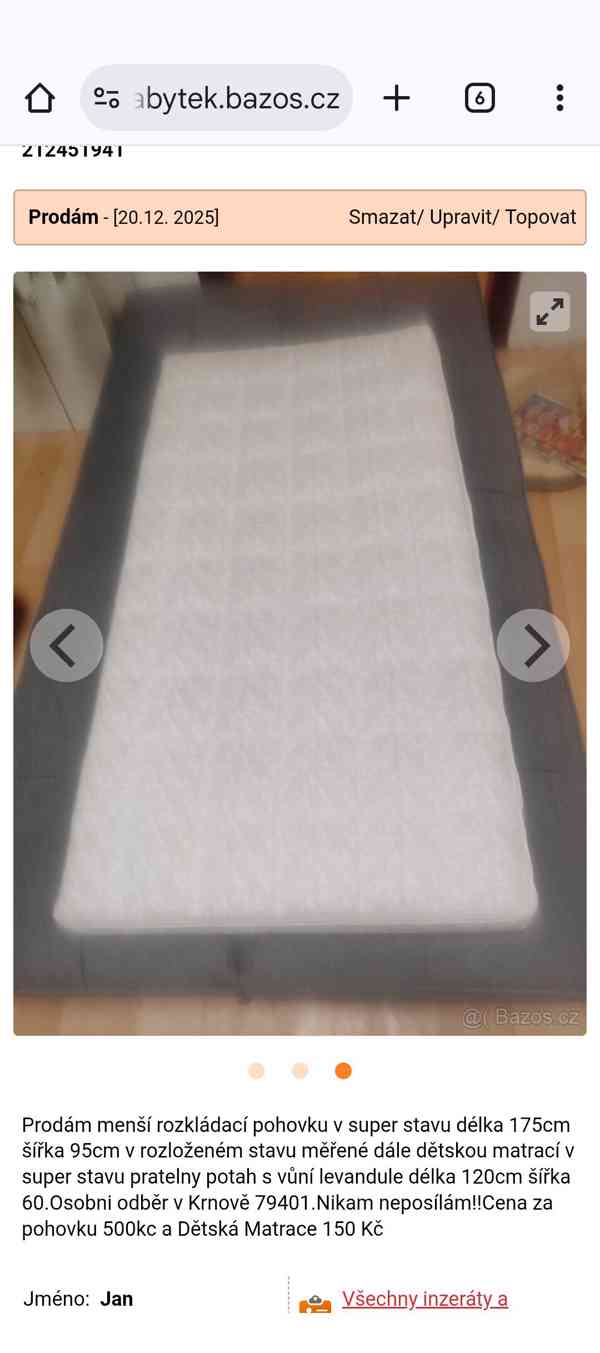 Prodám menší rozkládací pohovku v super stavu délka 175cm šířka 95cm cm v rozloženém stavu.Dale dětskou matrací v super stavu pratelny potah z vůni levandule délka 120cm šířka 60 .Cena pohovky 500kc Dětská Matrace 150 Kč .osobní odběr Krnov nikde neposílám !!!