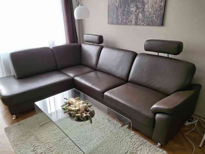 Prodám koženou sedací soupravu, tmavě hnědá, hovězí kůže, rozměry 200 x 263 cm, výška sedu 40 cm, 2 nastavitelné a odnímatelné hlavové opěrky, nohy chrom. U kratšího dílu sedací soupavy je i zadní část potažena kůží pro možnost umístění do prostoru. Výroba SRN.
